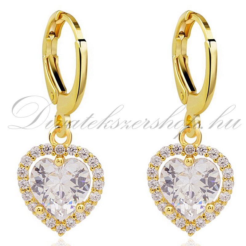Csüngős arany színű bizsu fülbevaló szív alakú fehér cirkónia medállal.